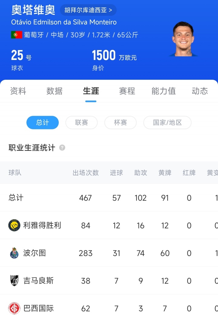 2023年夏窗,利雅得胜利花费6000万欧元,从波尔图签下28岁的奥塔维奥,当时他的身价是3500万欧元。效力利雅得胜利2年时间,奥塔维奥共出战84场比赛,贡献12粒进球和16次助攻,目前奥塔维奥的德转身价为1500万欧元。