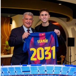 2月6日讯 费尔明正式与巴萨签字续约,巴萨官推晒出费尔明与球队主席拉波尔塔合照,并获赠印有2031号码的纪念球衣。巴萨官...